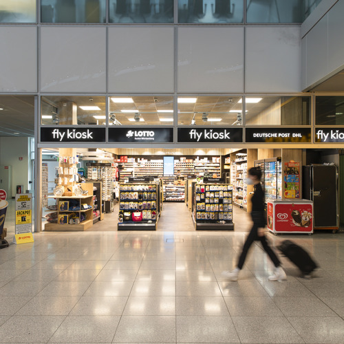 The range of the "FLY Kiosk" includes tobacco products, gifts, travel items, hot and cold drinks and confectionery. The kiosk also offers the option of sending letters and parcels with Deutsche Post DHL or handing in a lottery ticket to Lotto BW.