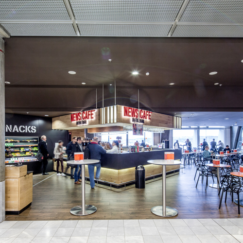 In a comfortable atmosphere, drinking a glass of wine while enjoying food music and being provided with the latest news - this service is offered by the News Café. Additionally, a wide range of paninis and salads, as well as baked goods, veal sausage and frankfurters is offered. The café provides sufficient space for 180 guests.